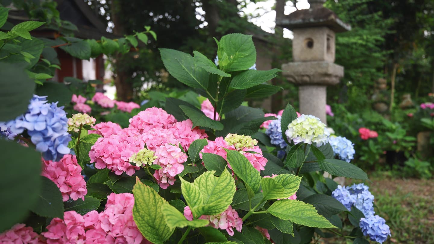 6月になると、境内では地植えの紫陽花や鉢植えの紫陽花約300鉢が一斉に咲き始めます。特に、紫陽花の花を球体ガラス器に入れた「アジサイガラスボール」は、ここ般若寺がその先駆け。境内の見どころスポットも増え、どこを切り取っても映える美しい風景が広がります。